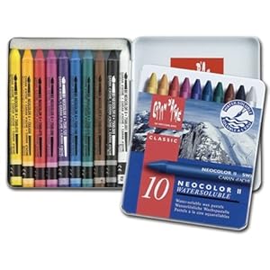 Product Description : From the ManufacturerCaran d'Ache Neocolor II Water Soluble Pastels (10 Colors) Product Description : Superior-quality wax pastel for your little artists! Water-soluble, soft and easy to work, strong bright colors, very economical thanks to their exceptional covering power, excellent light fastness. Techniques: ? Dry or wet drawing on all materials ? Watercolor effects, washes, scraping out ? Suitable for use on (illuminated)signs and panels Watercolors: ? Make a sketch, sprinkle it with water and allow the colors to dilute. ? Pick up colors from a palette and paint in wet as watercolor. ? Apply Neocolor II onto smooth paper and spread it onto the design with a stiff brush. Bold painting: ? Create a large design on dry paper. ? Spread the colors vigorously with wet fingers. Rainbow technique: ? Pick up the graded colors from a smooth palette and place the brush flat on the paper. Template: ? Apply Neocolor II on a template or on the edge of sheets of smooth paper. ? Spread the color onto the design with the fingers. Mono type: ? Draw with Neocolor II on a mirror or any flat glass surface. ? Cover the design with moist paper, press it down firmly then peel it off. ? Neocolor II washes off any smooth surface with water. Impregnation: ? Apply luminous colors onto tracing paper and rub them in with a cloth. ? Place the design behind a cutout. Comes in a tin box, great for storage.