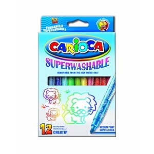 Product Description : From the ManufacturerCarioca Superwashable markers use water based ink and will wash easily off of skin with just water and will wash out of clothes on a normal wash cycle, without stain remover. These kid-friendly markers make drawing fun and easy for young ones. The dual-tip of the CreaTip marker allows for drawing of thick and thin lines. The caps of the markers have a built in ventilation system, so they pose no choking risk. Kids love the bright, bold colors of this art set. Carioca is an Italian art company that has been producing fine children's art products for over 50 years.