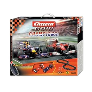 Product Description : The Carrera Champions Racing Set is a dazzling course that will fill your child's need for speed! Man the 2 speed controllers to accelerate the Ferrari F10 "Fernando Alonso" race car and the red Bull RB5 "Sebastian Vettel, No. 15". Watch as they speed through the long straightaways and skim the guardrails on the sharp turns! Experience the rush of a professional racer with this toy race track! When assembled, the dimension of the track are 4.95 x 2.69 ft./ 151 x 82 cm, and the track length is 11.81 ft./ 3.6 m. Parts included: 1 "Fernando Alonso" Ferrari F10, 1 "Sebastian Vettel, No. 15" Red Bull RB5, 5 Straights 13.46 in./ 342 mm, 1 Straight 4.48 in./ 114 mm, 6 Curves 1/90 degrees, 1 Connecting track fragment, 1 Straight with lap counter, 2 Speed controllers, 1 transformer, Support Set, Track bolts, Guardrails, Replacement contacts, Extra guide keels, Instructions.
